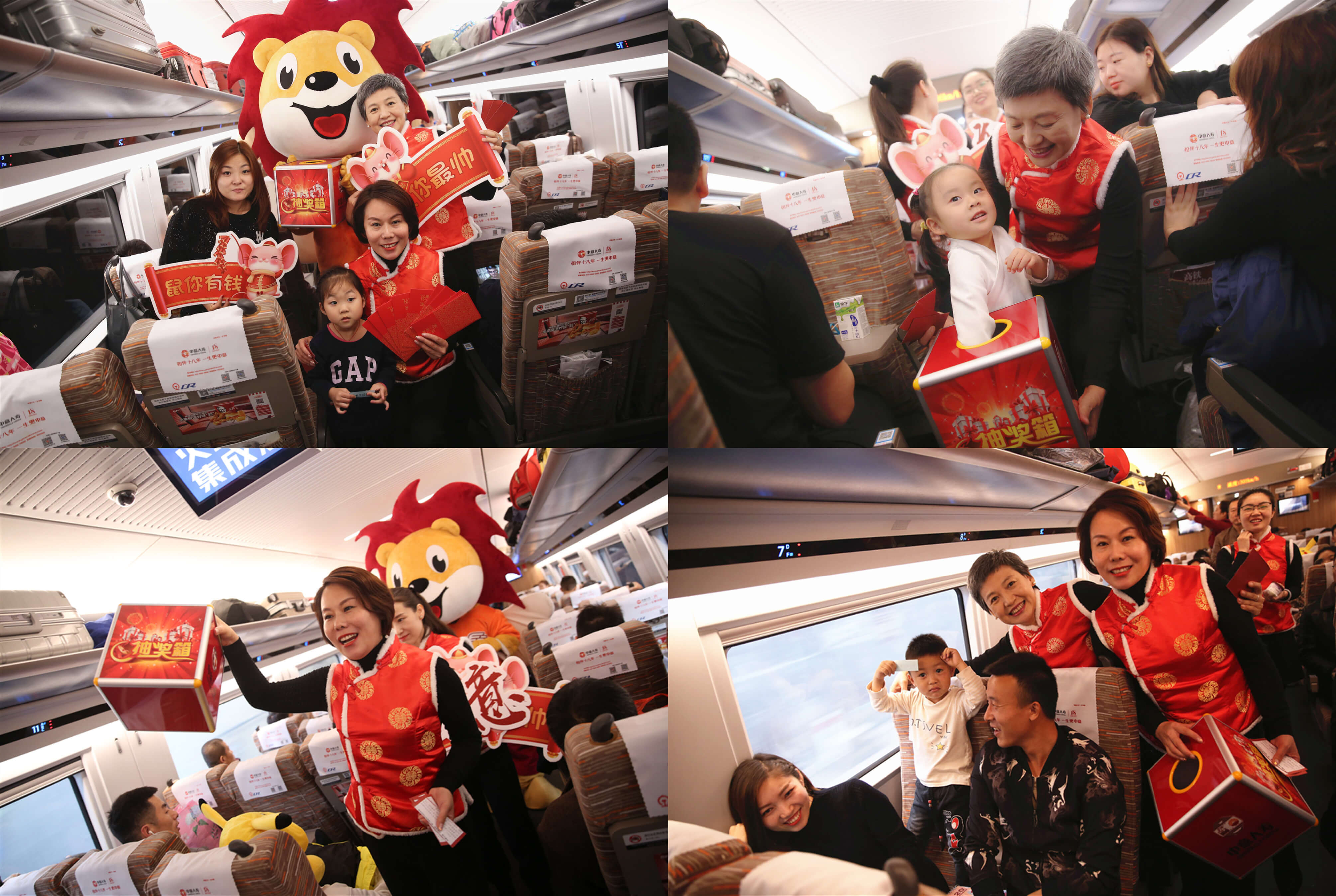 車內(nèi),中意人壽送福小分隊與旅客們進行“抓福氣 過新年”的抽獎互動游戲。誠意滿滿的獎品“福袋”里不僅有迎祥納福的新春對聯(lián)、象征財運的賀年紅包、北方民俗剪紙窗花、喜慶祈年創(chuàng)意“福”字帖,還有為旅客精心準備了“中意”出行保溫杯和吉祥物玩偶。福氣旺旺的中獎旅客們紛紛要求與吉祥物合影留念,抓福氣、送好禮環(huán)節(jié)讓人興趣十足,高潮迭起,愉快的歡笑聲伴隨著飛馳的列車一同前行。中意人壽護送四海旅客們平安歸家,給予他們歸途中最貼心的陪伴和對未來美好的期許,讓舟車勞頓的旅客們感受到家的溫暖。